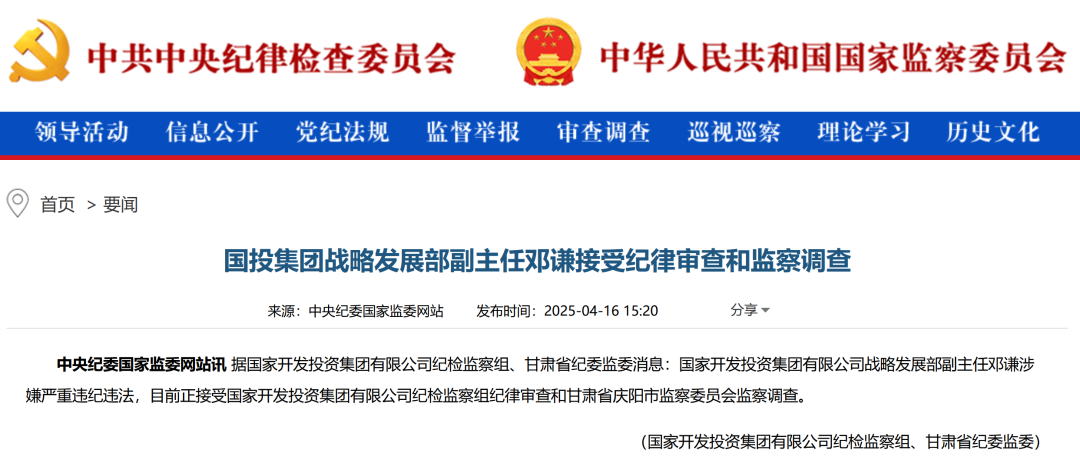 4月16日,国投集团战略发展部副主任邓谦接受纪律审查和监察调查。