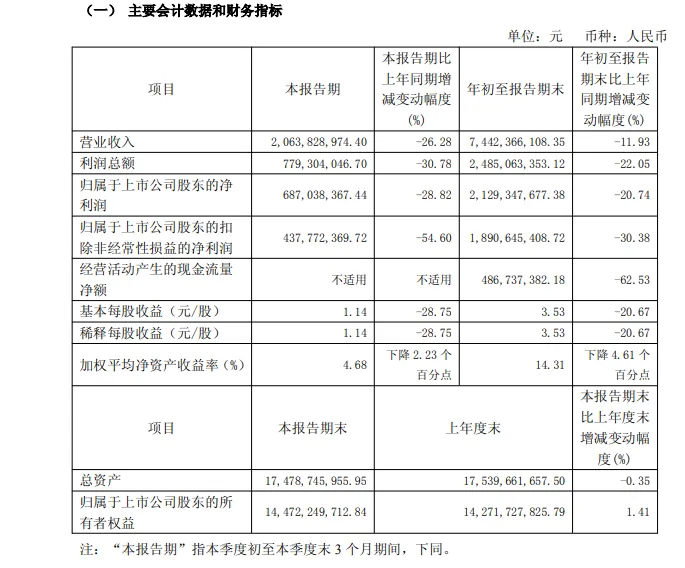 聚焦单季度表现,通过季度数据推算,第三季度营业收入20.63亿元,同比下降26.12%;归母净利润6.87亿元,同比下降28.83%,两项核心指标同比降幅均扩大至25%以上,业务端压力不断加剧。