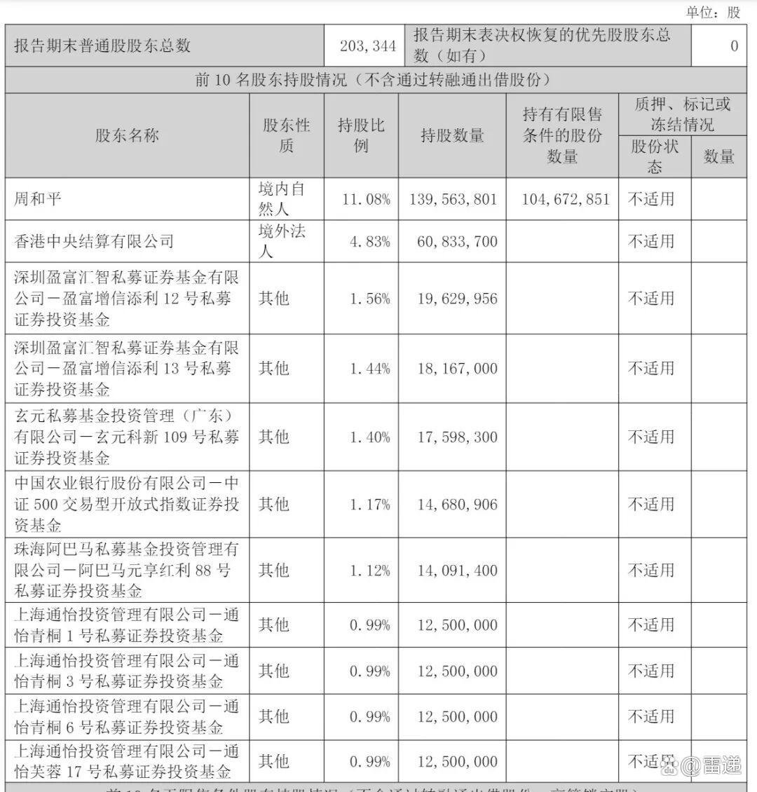 截至2025年9月30日,周和平持股为11.08%,周和平一共控制15.05%股权。