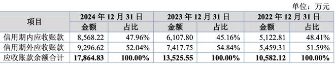 2022年至2024年(下称“报告期”)各期末,公司应收账款余额分别为10582.12万元、13525.55万元和17864.83万元,占当期营业收入的比例分别为74.23%、80.32%和76.19%,应收账款规模较大。