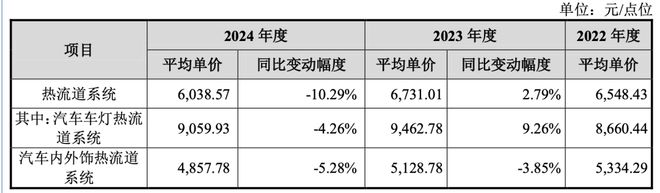 报告期各期,公司主营业务毛利率分别为56.20%、55.22%、50.86%和50.21%。公司主营业务毛利率的变动主要受收入占比最高的热流道系统产品毛利率变动影响。2024年,公司热流道系统的平均单价较去年同期下降10.29%,尤其是应用于汽车行业的产品平均单价均有不同程度的下滑。