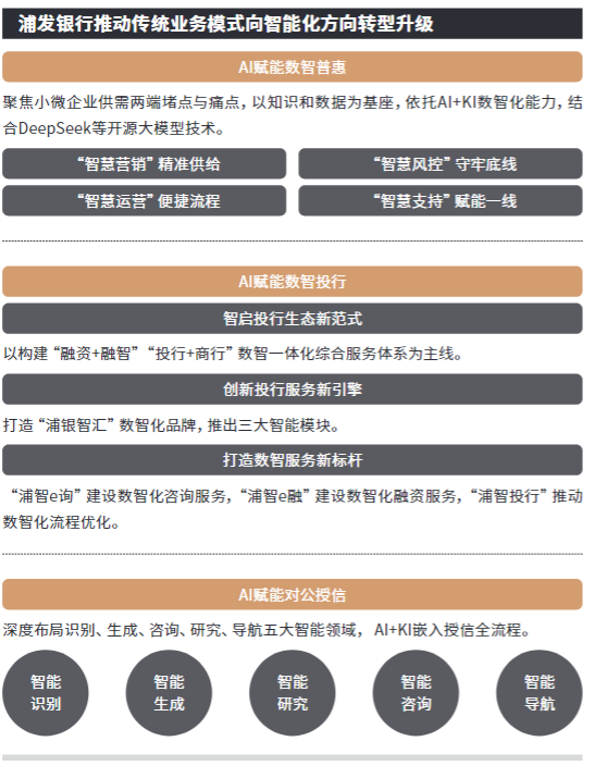 近年来,浦发银行遵循数智化战略,构建亿级企业级知识资产库,塑造智慧营销、数智风控、智能服务、高效运营和智能管理五大类大模型应用场景,全面提升客户洞察、行业研究、财务分析及报告写作等数智能力,赋能“五篇大文章”,实现“人工智能+”时代下的银行业务新模式和智慧金融新业态。