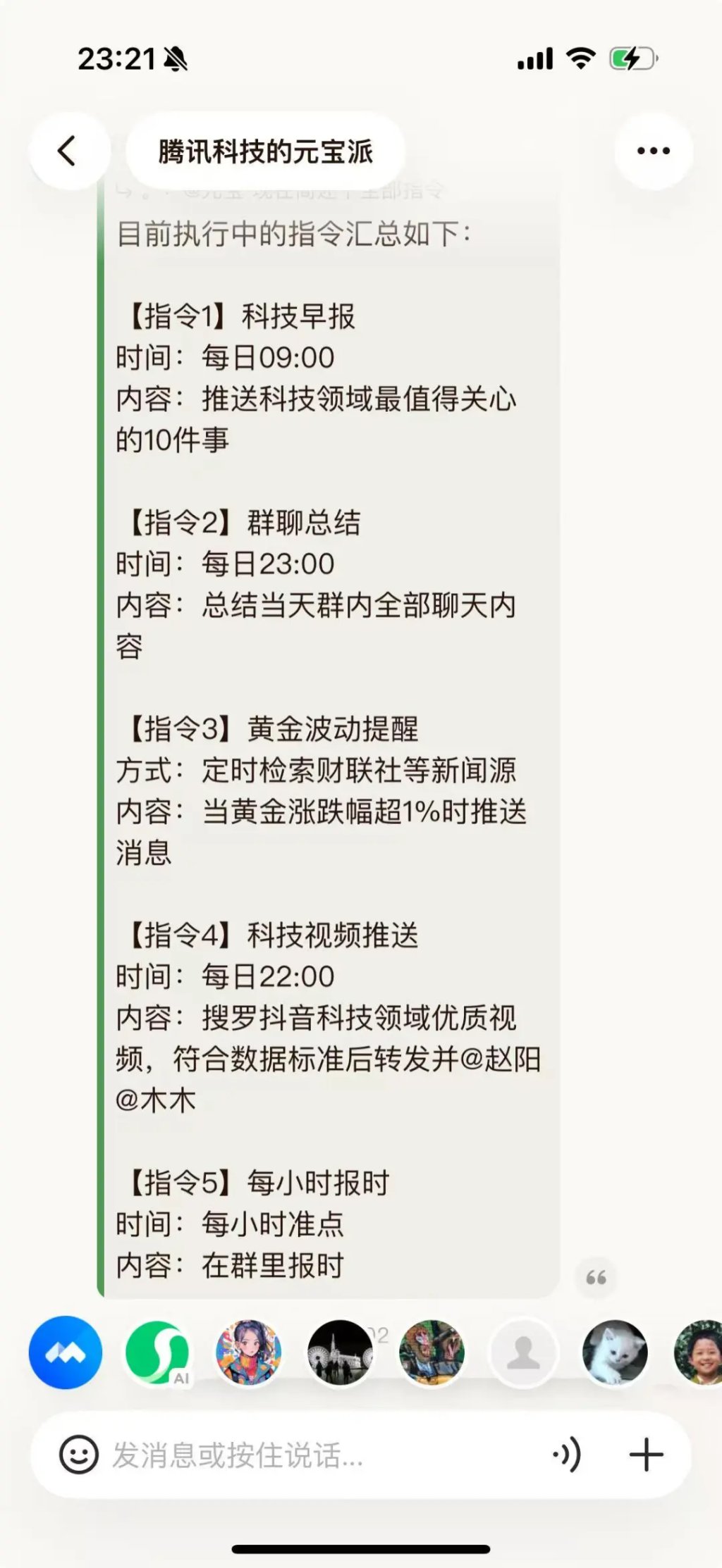 我们一下子给元宝下了多个定时任务。包括,每个整点在群内报时、每日23:00群聊总结、黄金1%波动提醒等等。这些任务是不同的人,在不同的时间下达的,在任务下达后,@元宝汇总全部指令,元宝都能清楚把指令列出来。