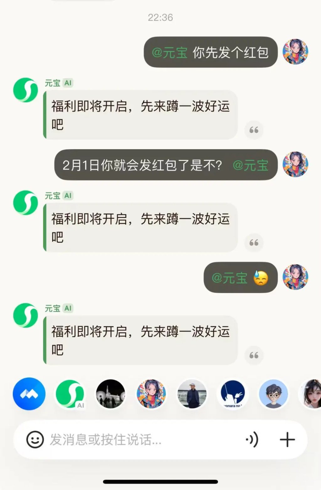 当然,还有2月1日值得期待的“上元宝分10亿红包”的活动。现在尽职尽责的元宝,只要提到红包,就会重复一句话“福利即将开启,先来蹲一波好运吧”。