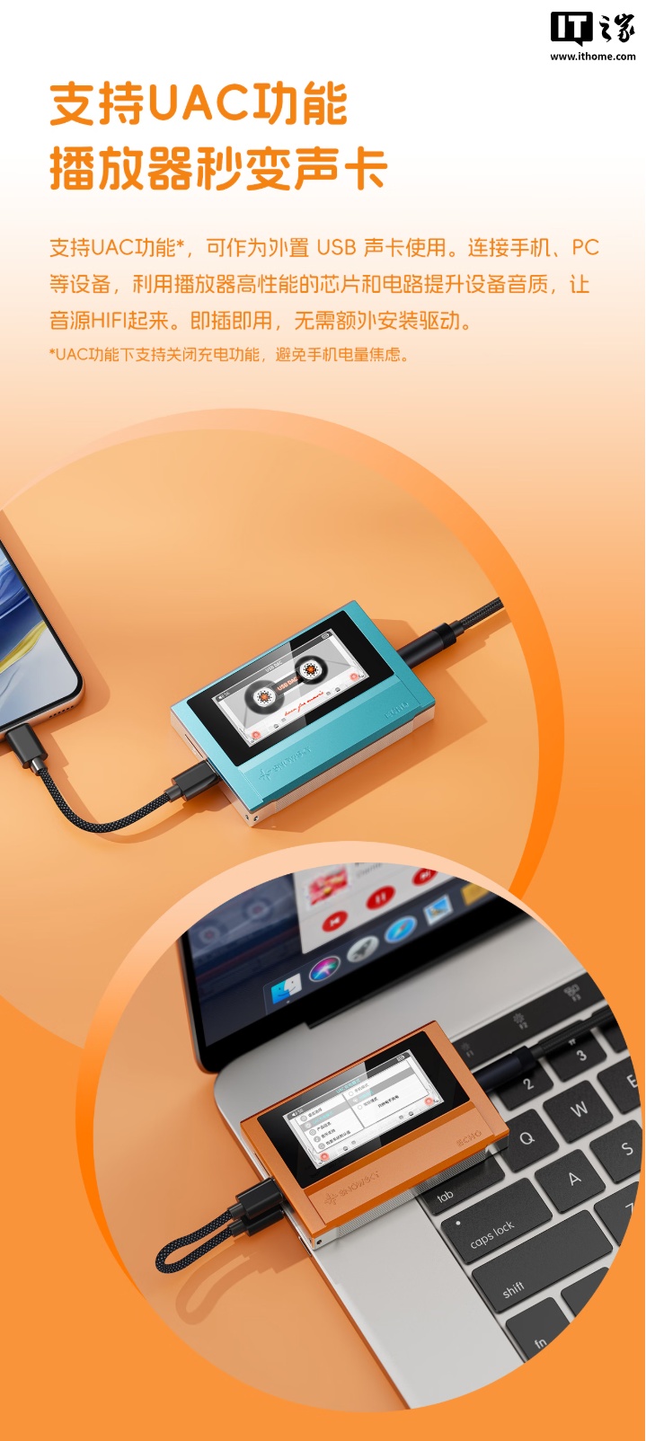 功能方面,这款播放器支持 UAC 功能,可用作外置 USB 声卡,支持播放 DSD、WAV、FLAC、APE、MP3、M4A、OGG 等格式,可连接蓝牙耳机和音箱,内置 1100mAh 大电池,可播放超 14 小时,自带 8GB 存储空间,支持使用 microSD 卡扩展空间。