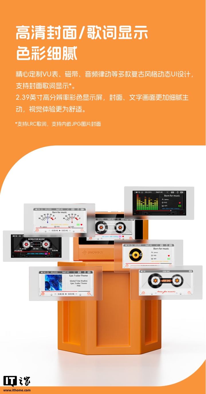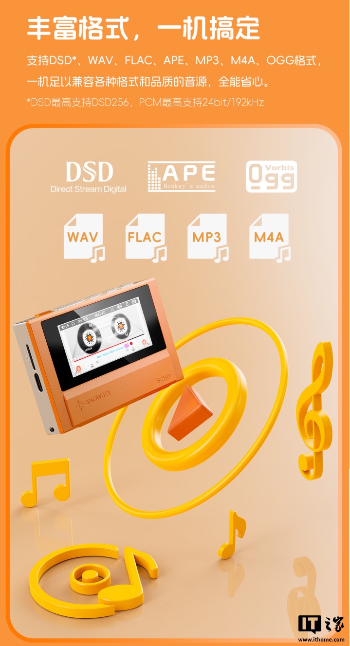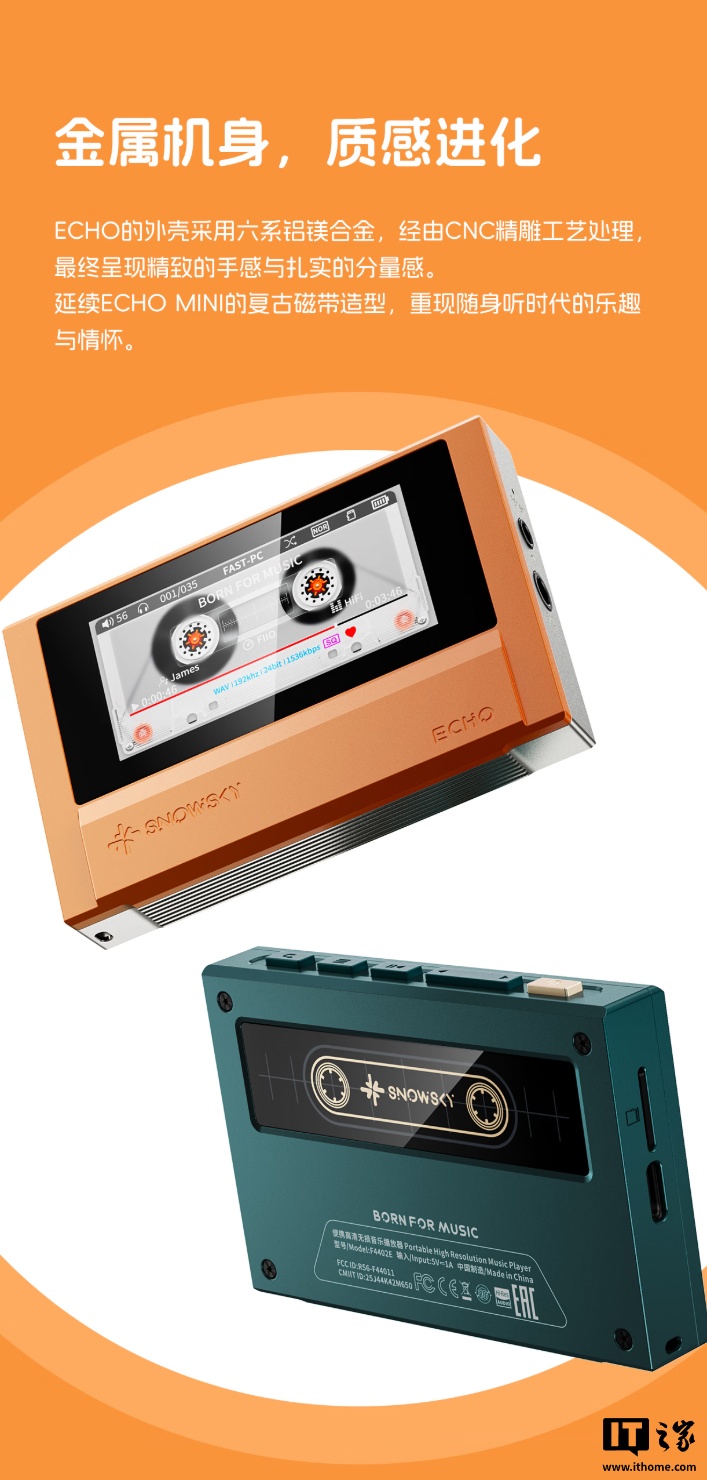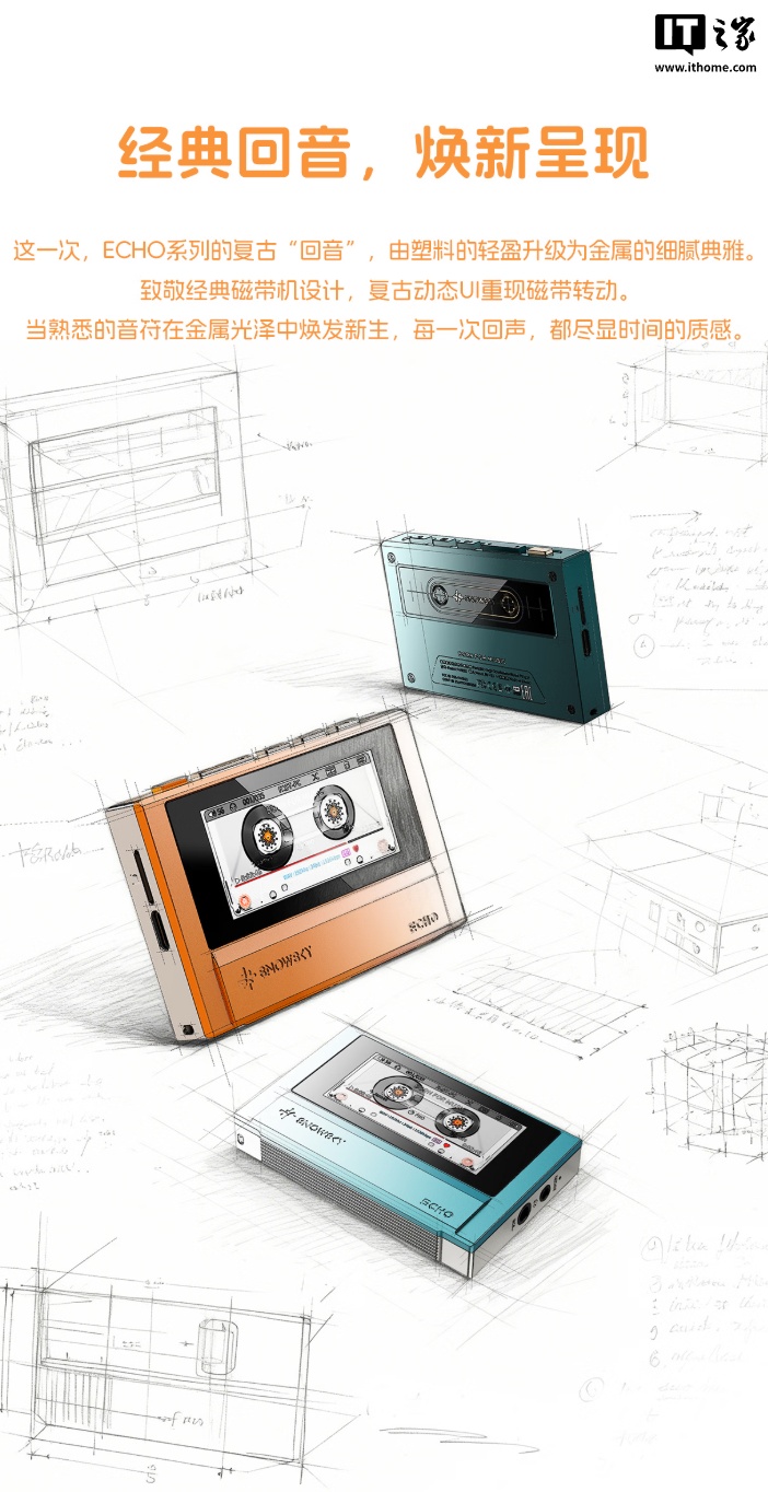 IT之家 1 月 27 日消息,飞傲子品牌雪漫天现已推出 ECHO 播放器,新品主打磁带随身听复古设计,带有 3.5mm 单端+4.4mm 平衡耳机接口,内置双 DAC 芯片,新品预约价 399 元。