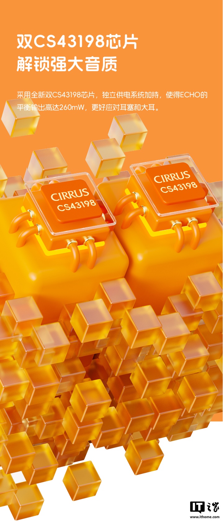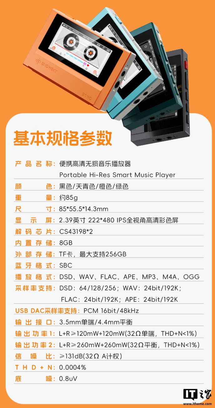 规格方面,这款播放器搭载双 Cirrus Logic CS43198 DAC 芯片,拥有独立供电系统,平衡输出可达 260mW,更好应对耳塞、大耳等,自带 3.5mm 单端+4.4mm 平衡耳机接口,广泛兼容各种 HiFi 耳机。