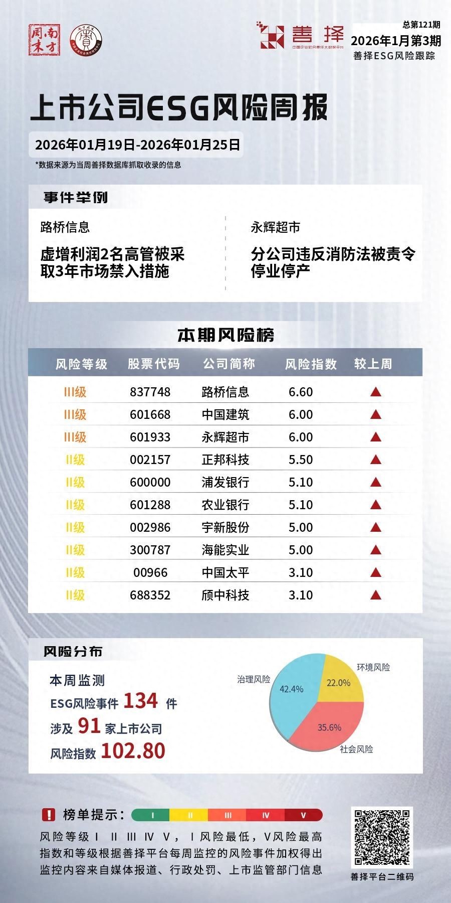 2026年1月第3周,91家上市公司曝光风险事件134起,风险指数102.80,其中治理风险占42.4%,环境风险占22.0%,社会风险占35.6%。路桥信息(837748)、中国建筑(601668)、永辉超市(601933)ESG风险级别达到Ⅲ级。路桥信息虚增利润2名高管被采取3年市场禁入措施、永辉超市分公司违反消防法被责令停业停产等重大风险事件值得关注。