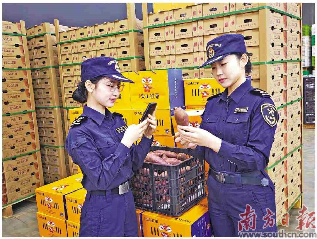 霞海海关关员对遂溪特色农产品火山红薯进行检疫。舒月吟 摄