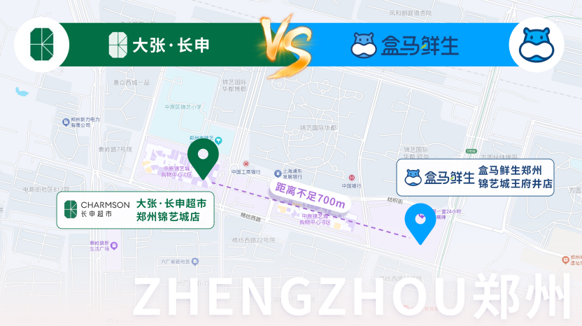 大张旗下长申超市郑州新店与盒马贴身肉搏,相距仅700米;鲜风生活新店与永辉首改店隔路对垒;再加上即将开业的胖东来、山姆……