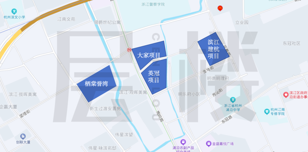 沿着两个项目南侧的生地街往东走,穿过高教园小学,第三个玩家——滨江建杭浦沿地块便映入眼帘。