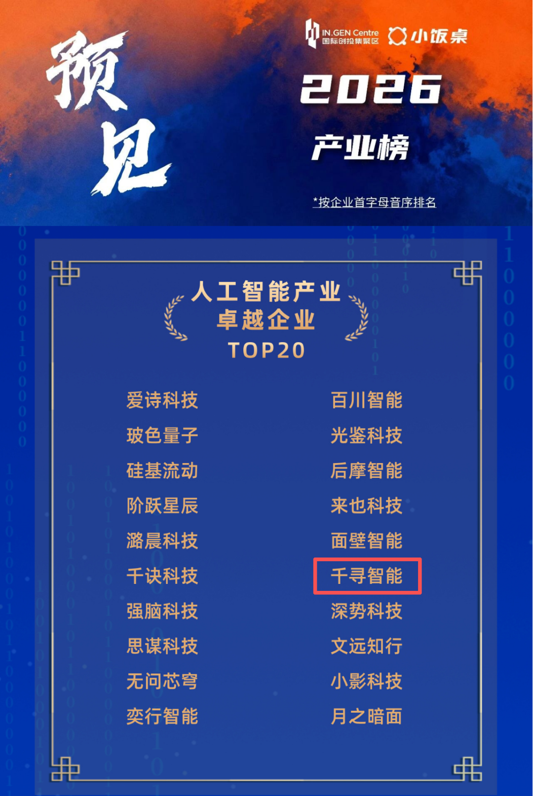 千寻智能入选“预见·2026”年度榜单,荣获【人工智能产业卓越企业 TOP20】。该榜单被誉为科创领域的“未来图谱”,旨在寻找从全球竞争参与者跃迁为规则“定义者”的中国创新力量。