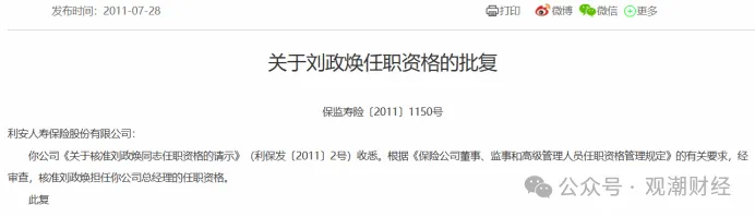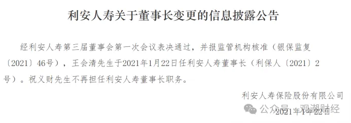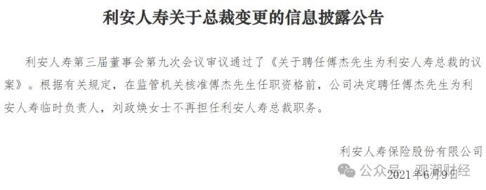2021年1月,利安人寿发布董事长变更公告称,王会清于2021年1月22日任利安人寿董事长,祝义财不再担任利安人寿董事长职务。同年6月,该公司聘任傅杰为临时负责人,刘政焕不再担任利安人寿总裁职务。其与祝义财是目前为止在任时间最长的总裁、董事长。
