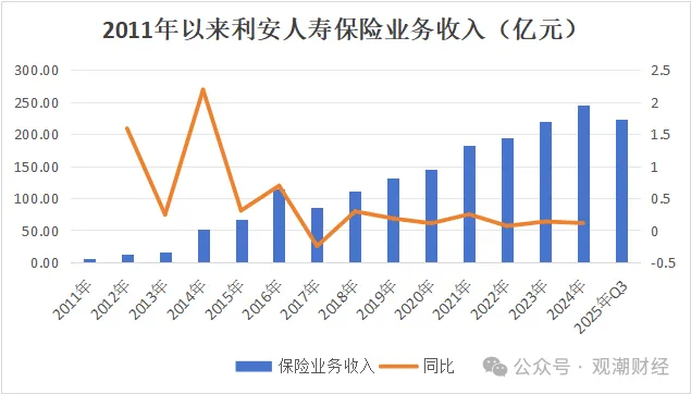 从收入端来看,利安人寿保险业务收入除2017年下降24.8%至85.75亿元,其余年度均同比上升。2024年,该公司保险业务收入为244.57亿元,同比上升11.09%。2025年Q3,该公司保险业务收入为222.77亿元,不出意外,2025年全年保费收入将继续增长。