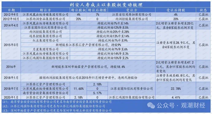 同年7月,江苏信托出资23.75亿元,受让了苏汇资产管理、凤凰出版传媒集团和紫金投资集团合计持有的11.60%股份(约5.31亿股)。此次转让后,江苏信托持股比例升至22.79%,成为利安人寿第一大股东;凤凰出版传媒集团则完全退出股东行列。至此,利安人寿国有股东合计持股50.82%,民营股东合计持股49.18%,国有持股比例再次超过民营股东,成为控制股东。