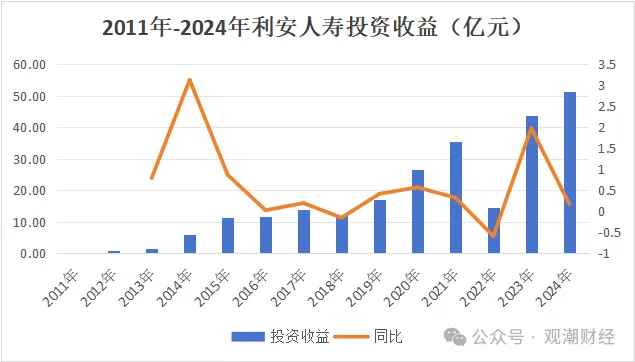 从投资端来看,该公司投资收益整体呈现上升趋势,不过该公司曾在2022年出现过一次大幅下滑,由35.45亿元同比下降58.56%至14.69亿元,这或是上述出现巨亏的重要原因之一。此后2年,该公司投资收益大幅回升。截至2024年末,该公司投资收益为51.42亿元,同比上升17.41%。