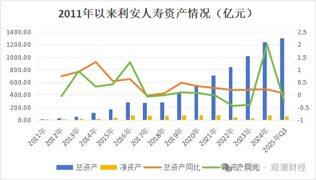 作为江苏省首家保险法人机构,利安人寿自成立以来发展态势迅猛:从2011年7月成立至2025年前三季度这14年期间,利安人寿的总资产规模从最初的14.58亿元,大幅扩张至1302.71亿元,成功跻身资产规模超千亿的中型保险公司行列。然而,净资产近年略有波动。