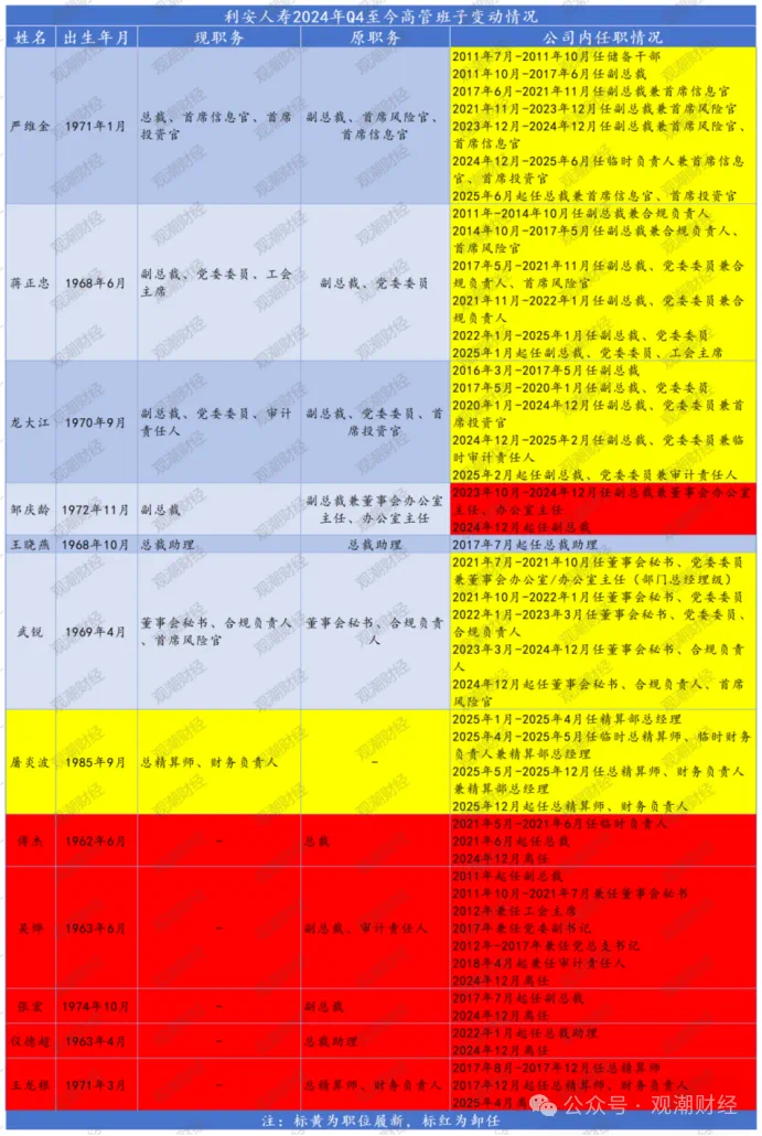 此时开始,围绕新目标及在过去相处中观察到的问题,周俊淑开始调整管理班子。从时间线可见,利安人寿在2024年底2025年初出现了高管班子大调整,部分高管离任,留任的高管大部分也出现了岗位调整。