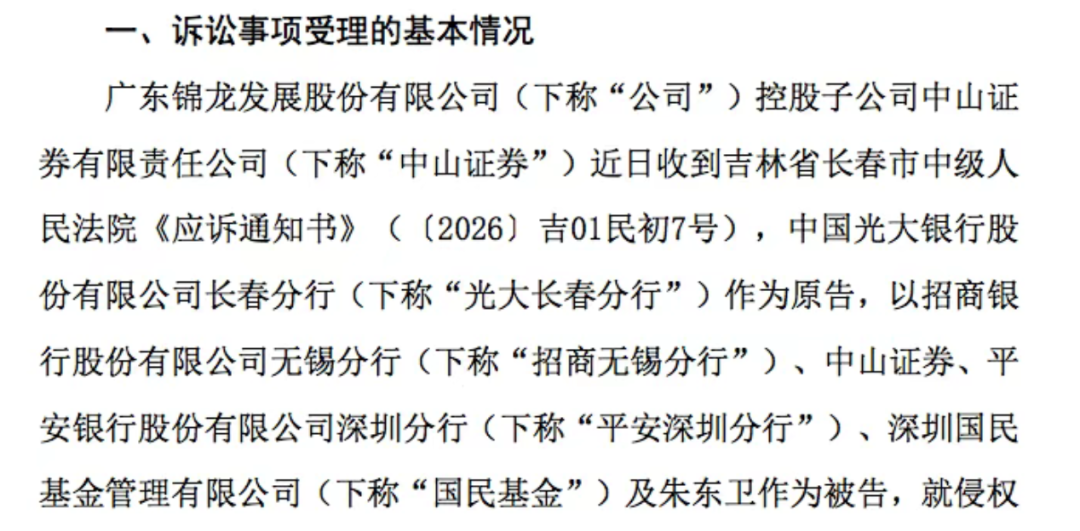 就在近日,光大银行在长春中院重新提起诉讼,这次被告名单明显拉长,除招商银行无锡分行外,还新增了中山证券、平安银行深圳分行、深圳国民基金,以及自然人朱某。