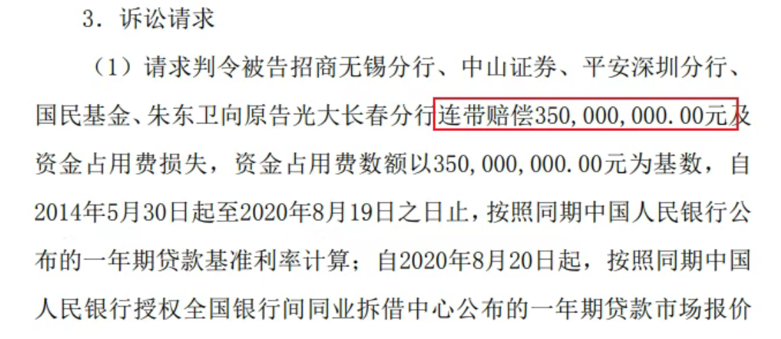 不光是被告人的名单加长了,涉诉金额也加码了。除3.5亿元本金外,光大还要求五被告共同赔偿2014年5月至2020年8月的资金占用费1.64亿元。