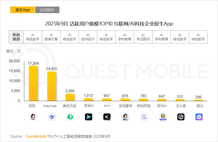 另外,QuestMobile公布的数据显示,若对比AI原生应用的月活规模,文心和同行并不在一个维度。以2025年9月为例,彼时阿里千问尚未发力C端,豆包和DeepSeek已经是亿级量级,腾讯元宝也远远甩开文心一言。