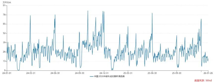 2)2024年以来30城销售面积变化如下图,2026年1月以来销售面积422.6万平方米,2024年和2025年同期分别为673.03万平方米和422.6万平方米。