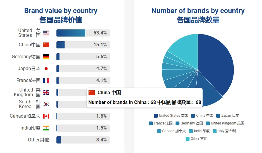 中国品牌整体表现亮眼,共计68家企业入选,虽上榜数量略有微调(2025年共有69个品牌),但单品牌平均价值稳步提升,展现出高质量发展态势。