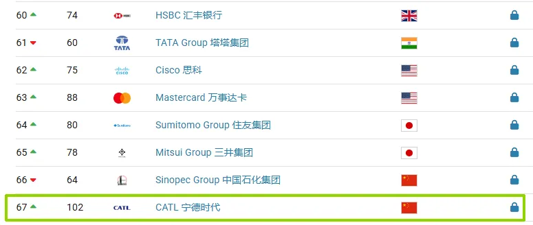 宁德时代:电池领域独领风骚,位列67,前进35名次。