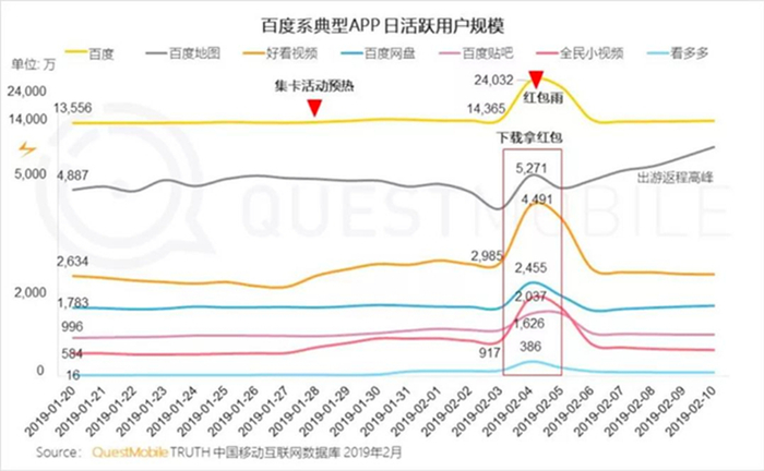 2019年春节,百度豪掷19亿红包将其App日活推至4亿,但据国金证券数据显示,除夕后7日内新用户留存率仅2%;此后两年,快手、抖音先后接棒春晚赞助,虽均创下日活峰值,但春节后用户留存率均未突破30%。巨额投入仅换来短暂流量,让大厂逐渐意识到此举得不偿失,收缩红包预算也成为必然。