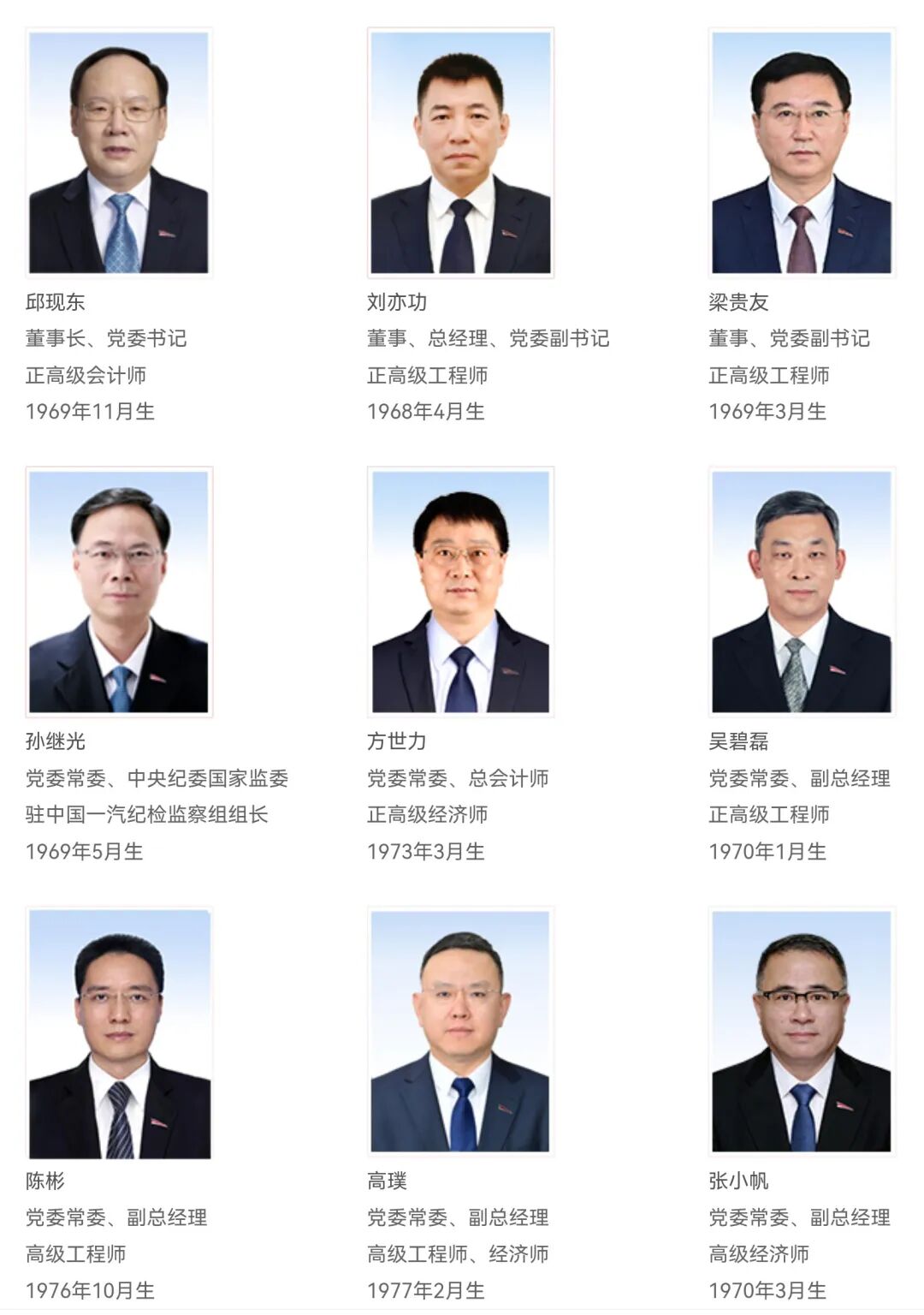 他们分别是邱现东(董事长、党委书记)、刘亦功(董事、总经理、党委副书记)、梁贵友(董事、党委副书记)、孙继光(党委常委、纪委书记,驻一汽纪检监察组组长)、方世力(党委常委、总会计师)、吴碧磊(党委常委、副总经理)、陈彬(党委常委、副总经理)、高璞(党委常委、副总经理)。