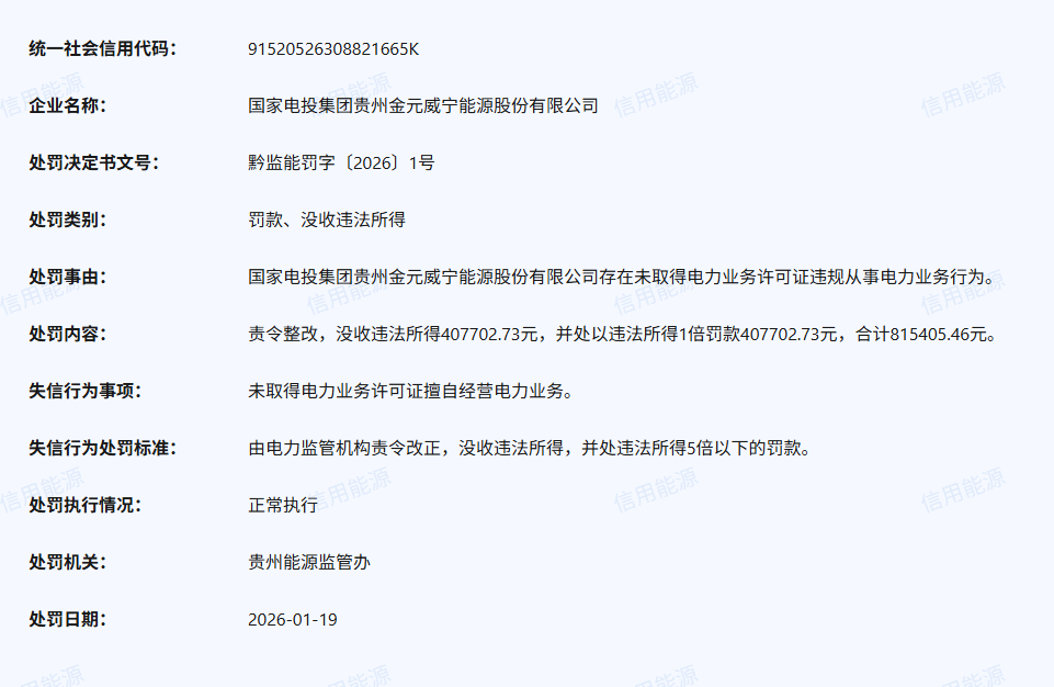1月19日,国家电投集团贵州金元威宁能源股份有限公司因“存在未取得电力业务许可证违规从事电力业务行为”受到贵州能源监管办处罚。该公司被要求责令整改,没收违法所得407702.73元,并处以违法所得1倍罚款407702.73元,合计815405.46元。