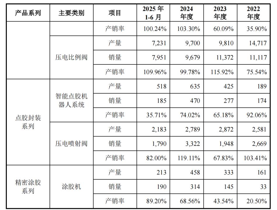 期内,公司流量控制、精密涂胶系列产品产销率整体呈上升趋势。具体来看,气体流量控制器、压电比例阀、涂胶机的产销率分别从2022年的35.9%、75.54%、20.5%升至2025年上半年的100.24%、109.96%、89.2%。