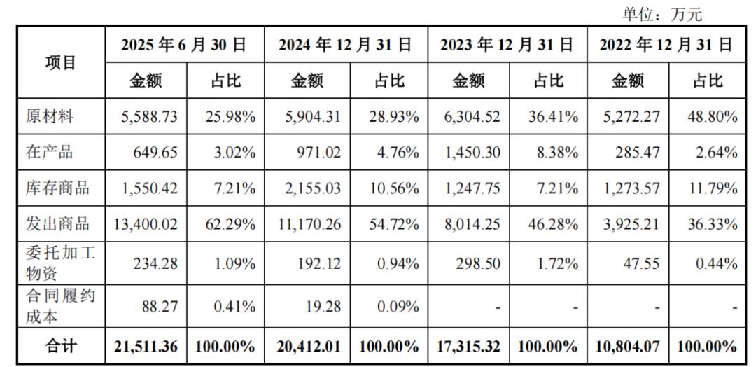 公司存货主要包括发出商品、原材料、在产品和库存商品。其中,发出商品占比快速增长,由期初的36.33%增至期末的62.29%。