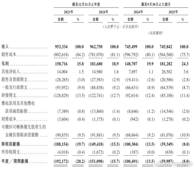 经调整后,公司2025年前9个月实现净利润2640万元,首次扭亏为盈,这一变化主要得益于毛利率的持续提升——从2023年的15.8%升至2024年的18.9%,2025年前9个月进一步跃升至24.3%,公司虽实现阶段性亏损收窄,但累计亏损规模仍居高不下。