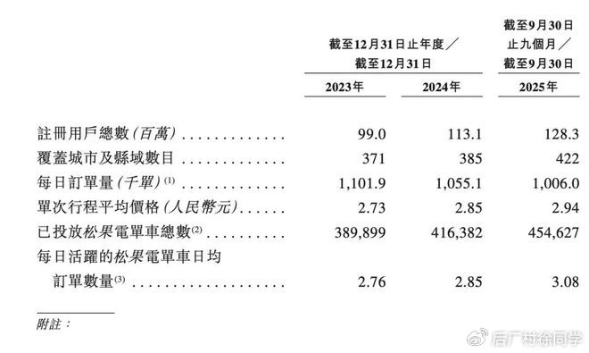 扭亏为盈背后,仍潜藏着不容忽视的两大风险隐患,第一,公司收入结构高度依赖共享电单车服务,2023年—2025年前9个月,该业务收入占比分别为98.1%、97.0%、93.6%,平台服务、广告服务等补充业务贡献有限,抗风险能力较弱;第二,用户订单量呈现持续下滑趋势,长江商报报道,松果出行2023年—2025年前9个月日均订单量从110.19万单降至100.6万单,公司不得不通过提高单次行程价格(从2.73元涨至2.94元)“以价补量”,这种模式的可持续性仍待观察。