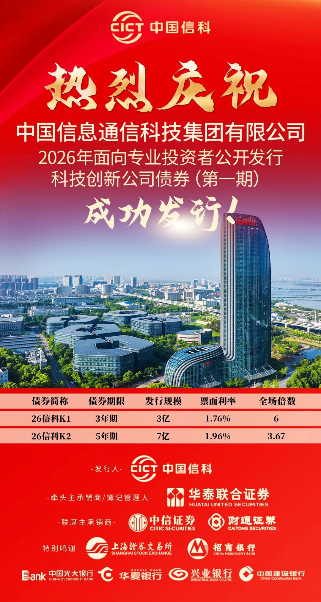 1月23日,中国信息通信科技集团有限公司(简称“中国信科”)在上海证券交易所顺利完成2026年集团首笔10亿元的科技创新公司债券,在3年期和5年期两个品种间双向互拨。其中,3年期发行规模为3亿元,票面利率为1.76%,认购倍数为6.0倍,低于估值约12个BP;5年期发行规模7亿元,票面利率为1.96%,认购倍数为3.67倍,低于估值约6个BP。本次发行旨在为接续集团到期的科技创新公司债券,并实现极具市场竞争力的融资成本。