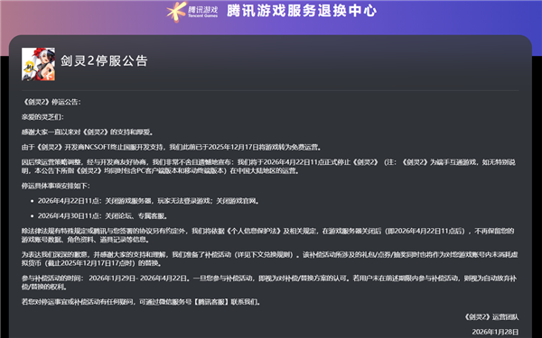 快科技1月28日消息,今日,腾讯代理游戏《剑灵2》运营团队发布停运公告,称由于《剑灵2》开发商NCSOFT终止国服开发支持,已于2025年12月17日将游戏转为免费运营。