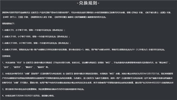 为表达歉意,官方准备了补偿活动,该补偿活动所涉及的礼包/点券/抽奖同时也将作为对玩家游戏账号内未消耗虚拟货币(截至2025年12月17日17点)的替换。