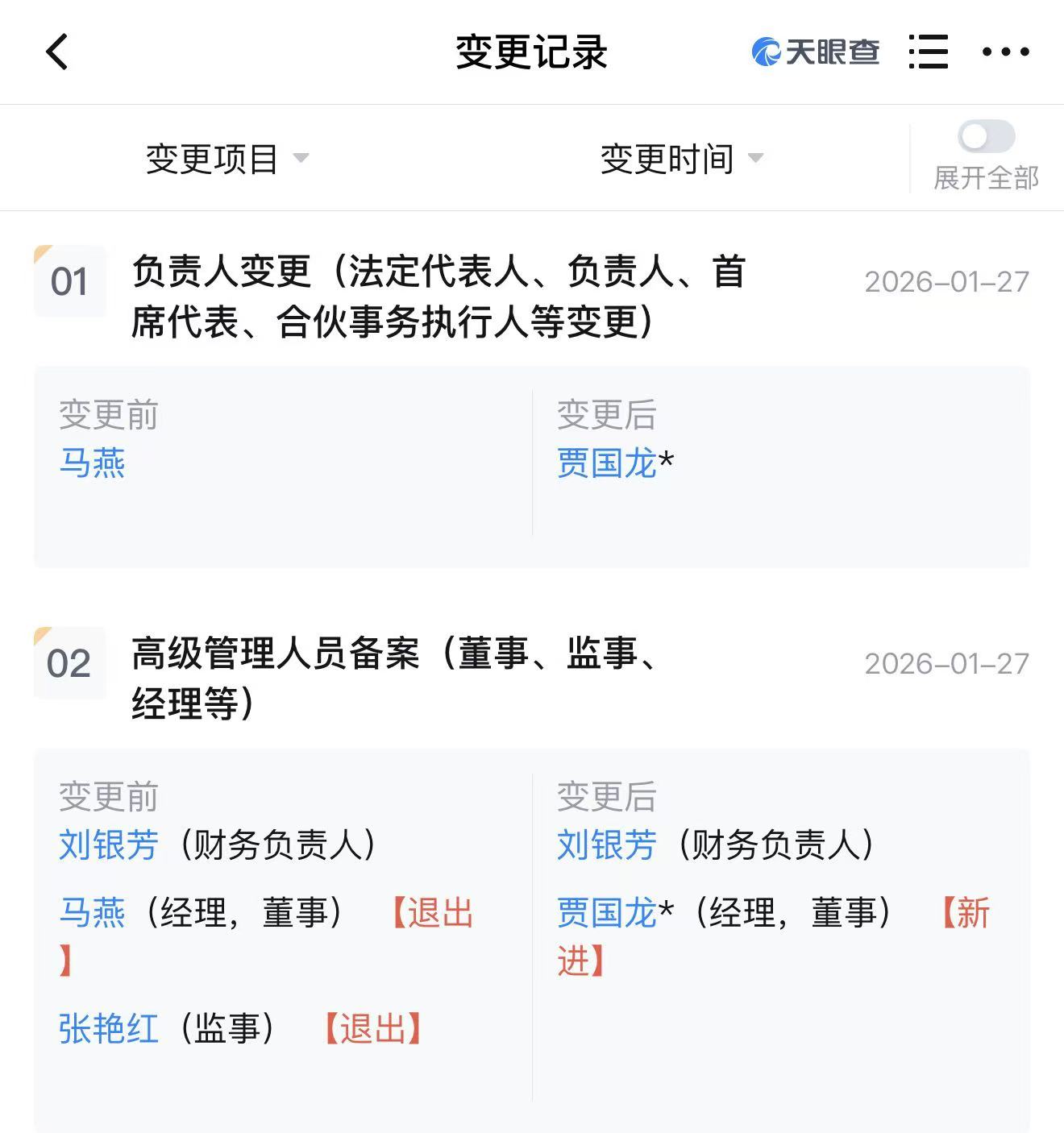 1月27日,北京西贝小牛餐饮管理有限公司发生工商变更,马燕卸任法定代表人、董事、经理,由贾国龙接任。
