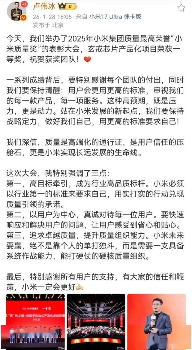 当下智能终端与新能源汽车行业竞争白热化,小米身处聚光灯下,既面临着外界的高期待,也遭遇着诸多挑战。卢伟冰的此番发言,既是回应行业争议,也是小米的自我觉醒。从性价比标杆到品质引领者,小米正在完成关键的品牌蜕变。