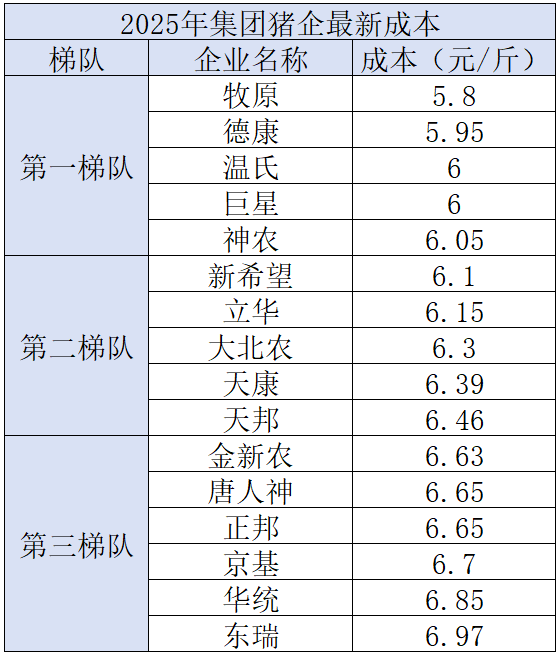 成本控制能力已成为生猪企业的核心竞争力,企业间的成本分化呈现加剧态势。数据显示,2025年16家上市猪企生猪平均生产成本为6.37元/斤,年度单斤成本降幅在0.4-0.7元/斤,但不同梯队企业的成本差距显著:牧原股份、德康农牧、温氏股份、神农集团等企业构成第一梯队,生产成本控制在6.05元/斤以下;新希望、立华股份等企业形成第二梯队,成本区间在6-6.5元/斤;正邦科技、京基智农等企业处于第三梯队,成本超6.5元/斤,头部与尾部企业单斤成本差距达1.17元,按单头猪200斤出栏重量计算,单头利润差距超230元。