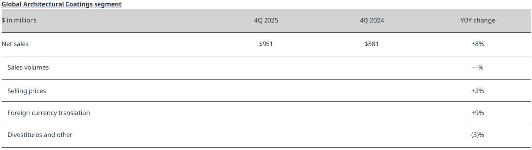 2025年第四季度,占据PPG业绩贡献约四分之一的全球建筑涂料部门净销售额虽同比增长8%(主要由提价和有利外币折算驱动),但EMEA(欧洲、中东和非洲)地区销量持续下滑,仅靠墨西哥和拉美市场的高个位数有机增长勉强支撑。更关键的是,该板块的增长高度依赖价格而非销量,且被俄罗斯业务剥离所部分抵消。