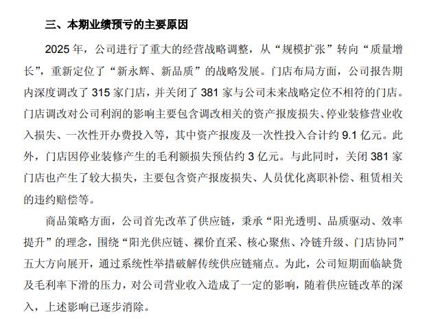 资产报废、停业损失、重装投入……这些在短期内集中计入损益,构成了永辉2025年亏损的重要来源。