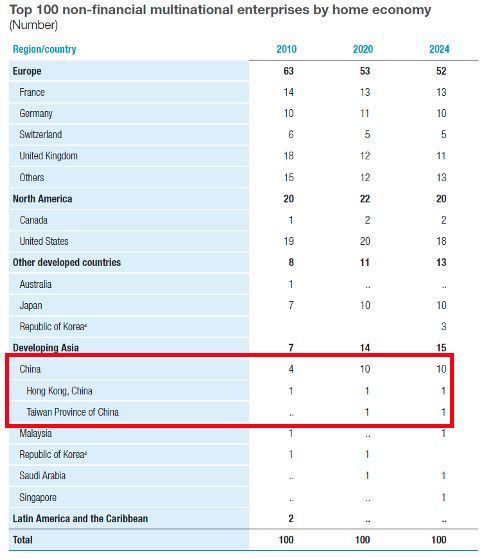 在这一背景下,联合国贸易和发展会议(UNCTAD)发布了一个榜单:在其2024年的相关报告中,全球前100家跨国公司里,中国企业占据10席,而美国约占18席。
