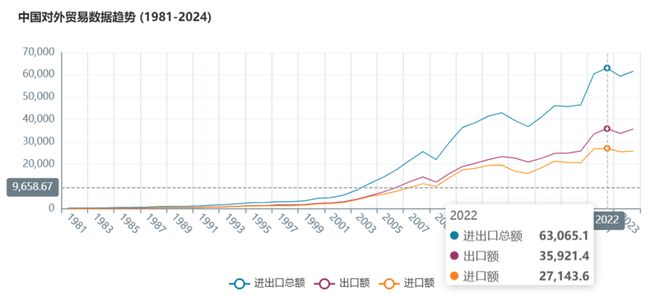 表二:中国对外贸易数据趋势(1981–2024)。数据来源:中国海关总署