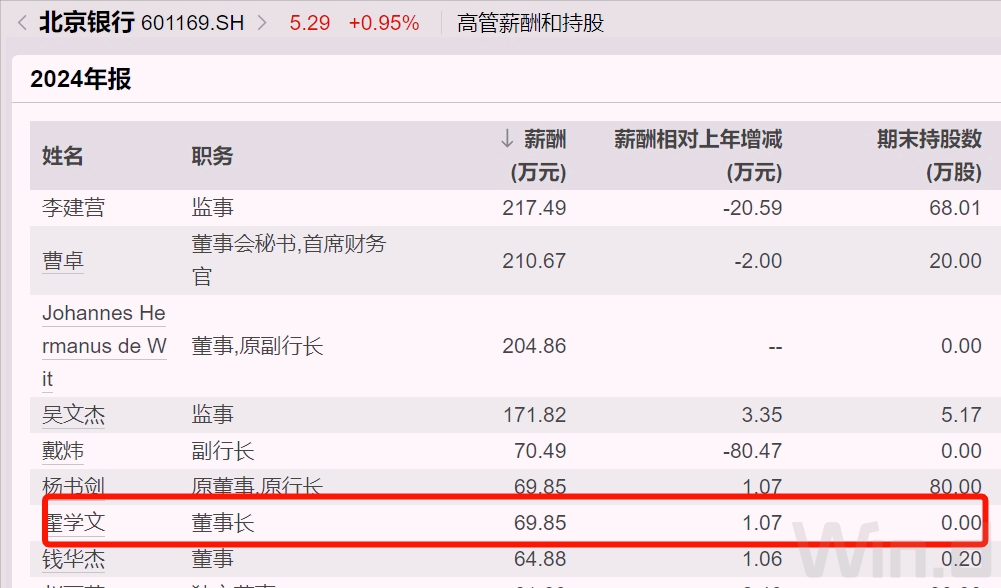 作为“一把手”,2024年,霍学文从北京银行领取的税前薪酬在高管中处在中等水平,不到70万元,和原行长杨书剑是“同样待遇”。