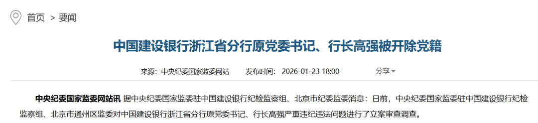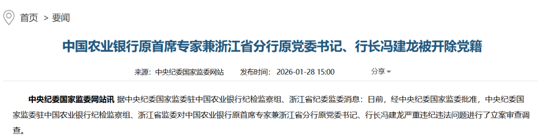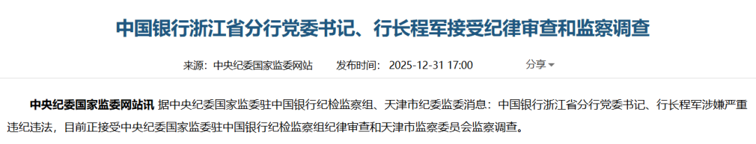 2024年以来,工农中建四大国有银行浙江省分行多名历任行长接连被查,从已退休的郭心刚、沈荣勤、高强、冯建龙,到2025年末仍在职的中行浙江省分行行长程军,省级分行“一把手”密集落马形成金融反腐领域罕见的集体塌方事件,涉案金额超20亿元,牵涉违规放贷、利益输送、退休后期权腐败等多重问题。这一系列查处不仅是金融反腐向纵深推进的标志性举措,更直指地方国有银行权力制衡失效、政商利益交织、监管机制滞后等深层病灶,为银行业治理敲响了振聋发聩的警钟。