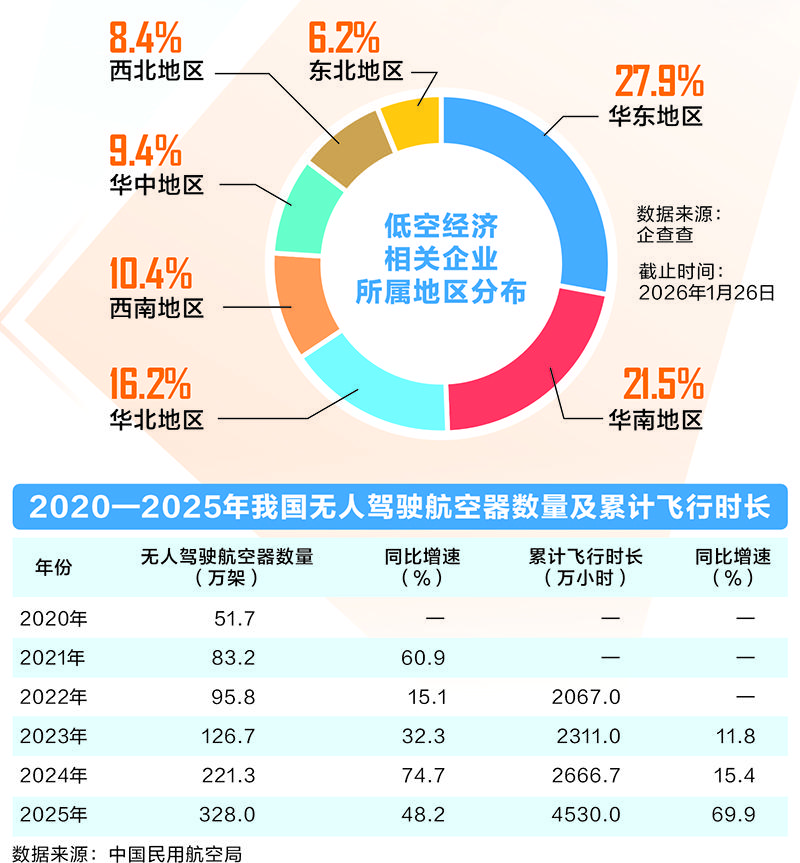 数据显示,截至1月26日,我国现存在业、存续状态的低空经济相关企业共计16.3万家,主要分布在华东、华南地区,占比分别为27.9%、21.5%,合计占据国内低空产业的近“半壁江山”;其次分布在华北、西南地区,占比均超过10%。