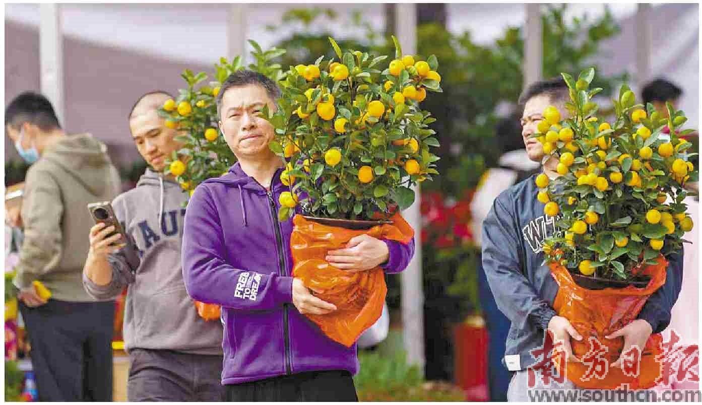 一盆年花,承载人们对美好生活的期许。图为珠海香山场文创年花集市内市民购买年花。
