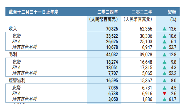 从整体业绩来看,安踏2024年全年营收达708.26亿元,归母净利润156.0亿元,毛利润440.32亿元,稳健的业绩增长背后,多品牌矩阵的协同效应持续释放。
